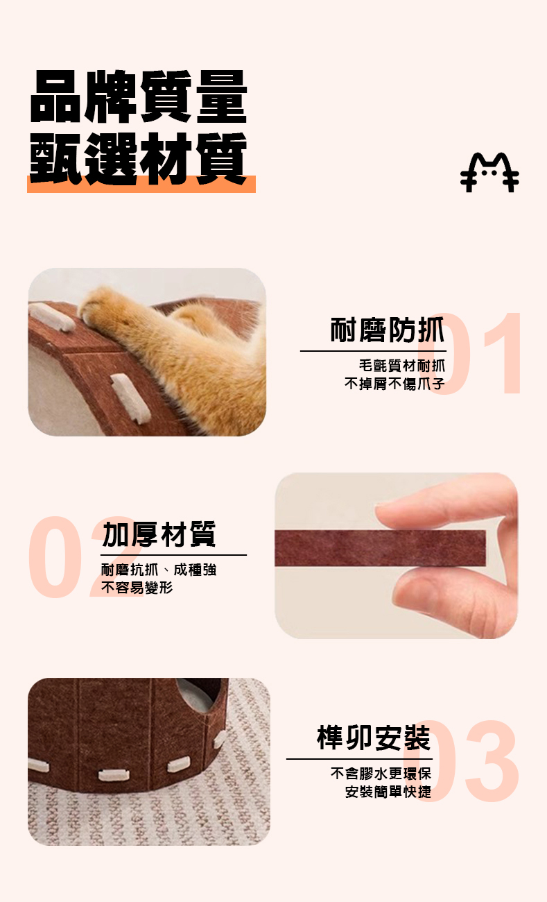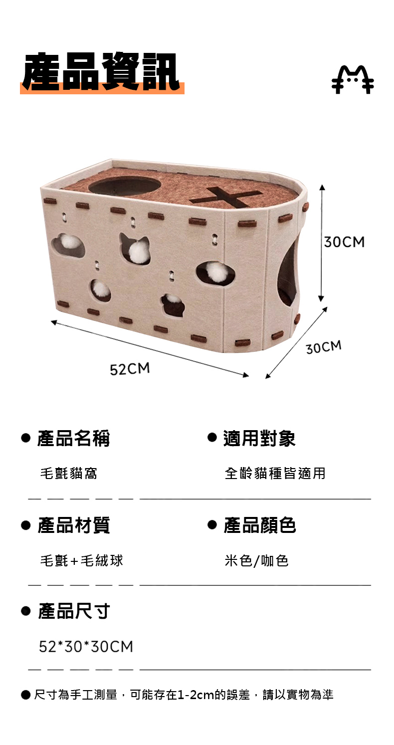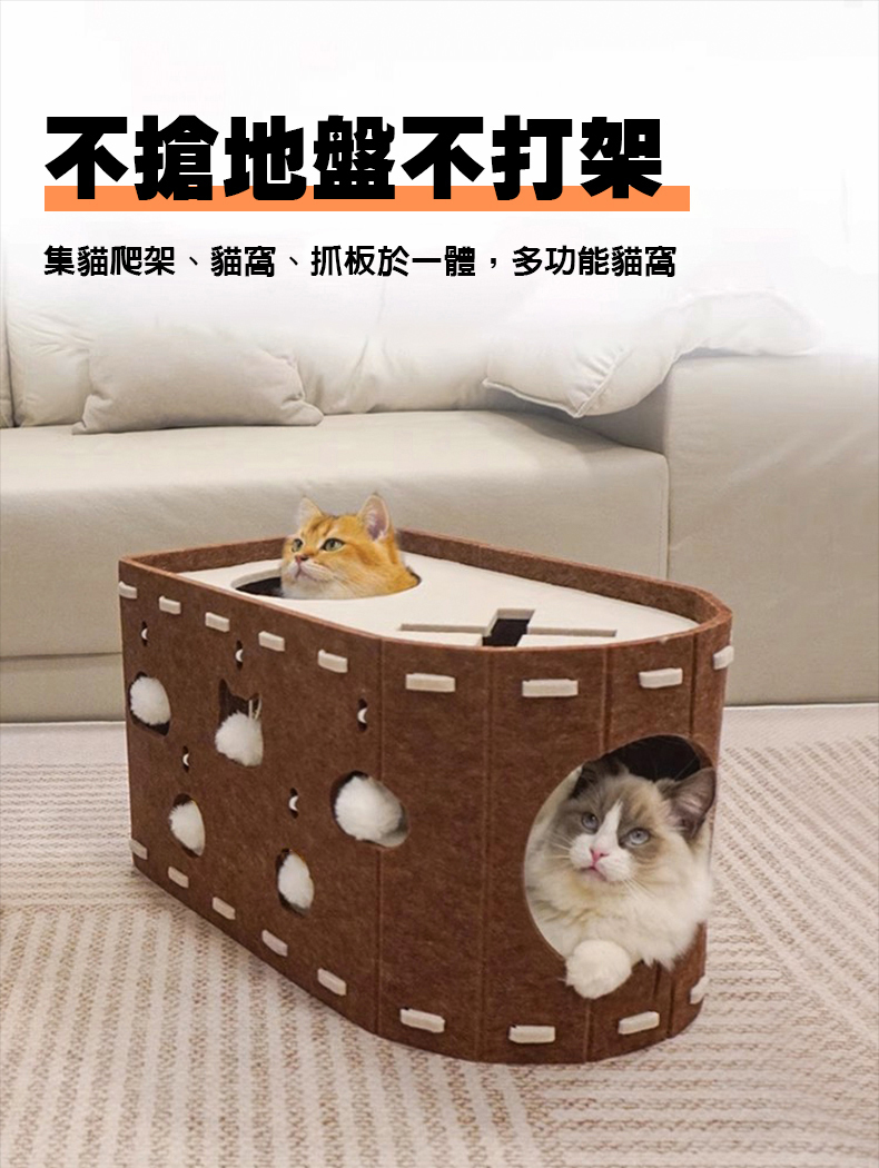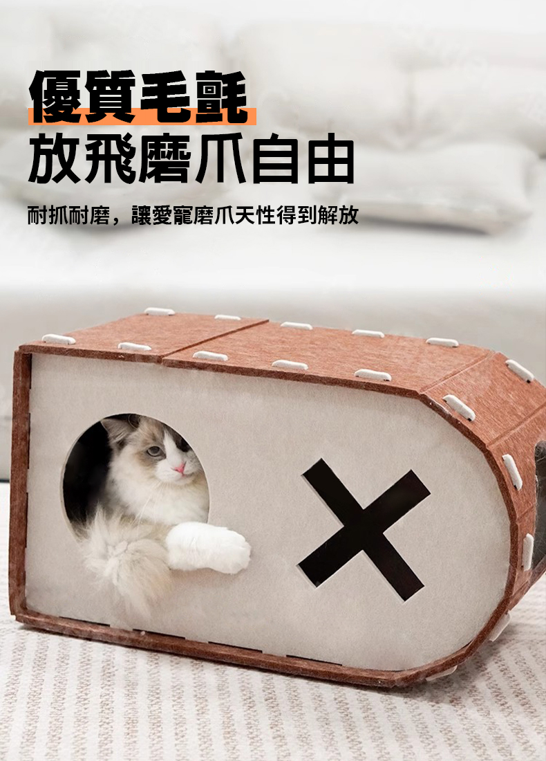【特色】 毛氈材質:環保耐抓,透氣不悶熱,適合四季使用。 半封閉設計:給貓咪滿滿安全感,打造舒適小天地。 輕巧好移動:隨處可放,客廳、臥室都能成為貓咪專屬窩。 堅固耐用:不易塌陷,長期使用依然舒適穩固。 【詳情】 https://runahana.com/wp-content/uploads/2025/10/01-1.mp4 重量 1.5 公斤 尺寸 37 × 90 × 10 公分 顏色 米色, 棕色