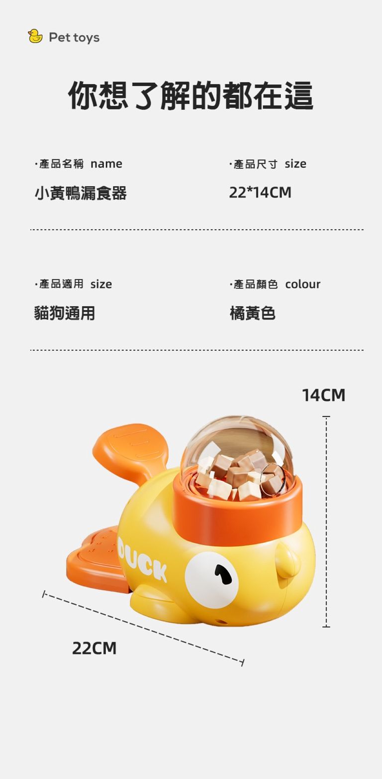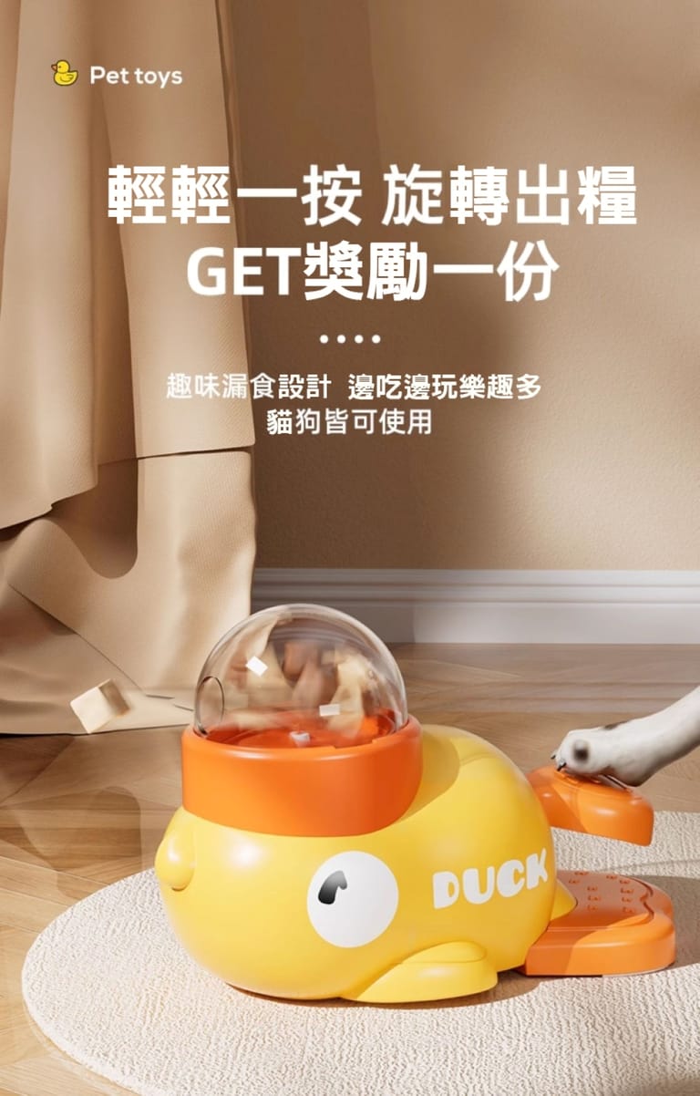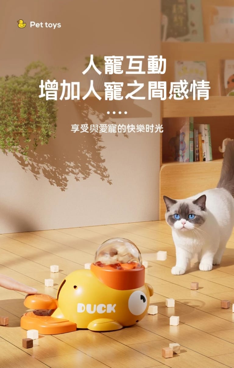 可愛小黃鴨造型:鮮豔顏色與造型吸引寵物目光,提升玩耍興趣。