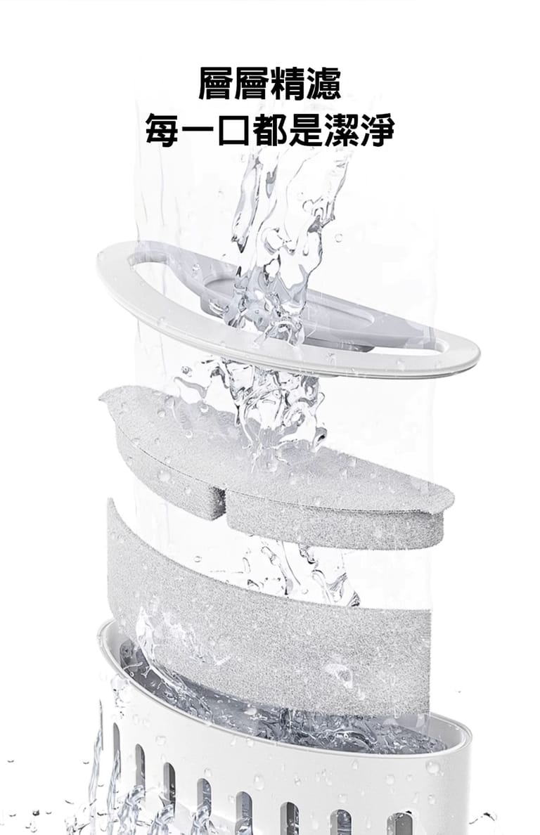 四重濾淨系統 層層過濾更安心:高密度棉+椰殼活性碳+離子交換樹脂+細密濾網,有效去除毛屑與異味。